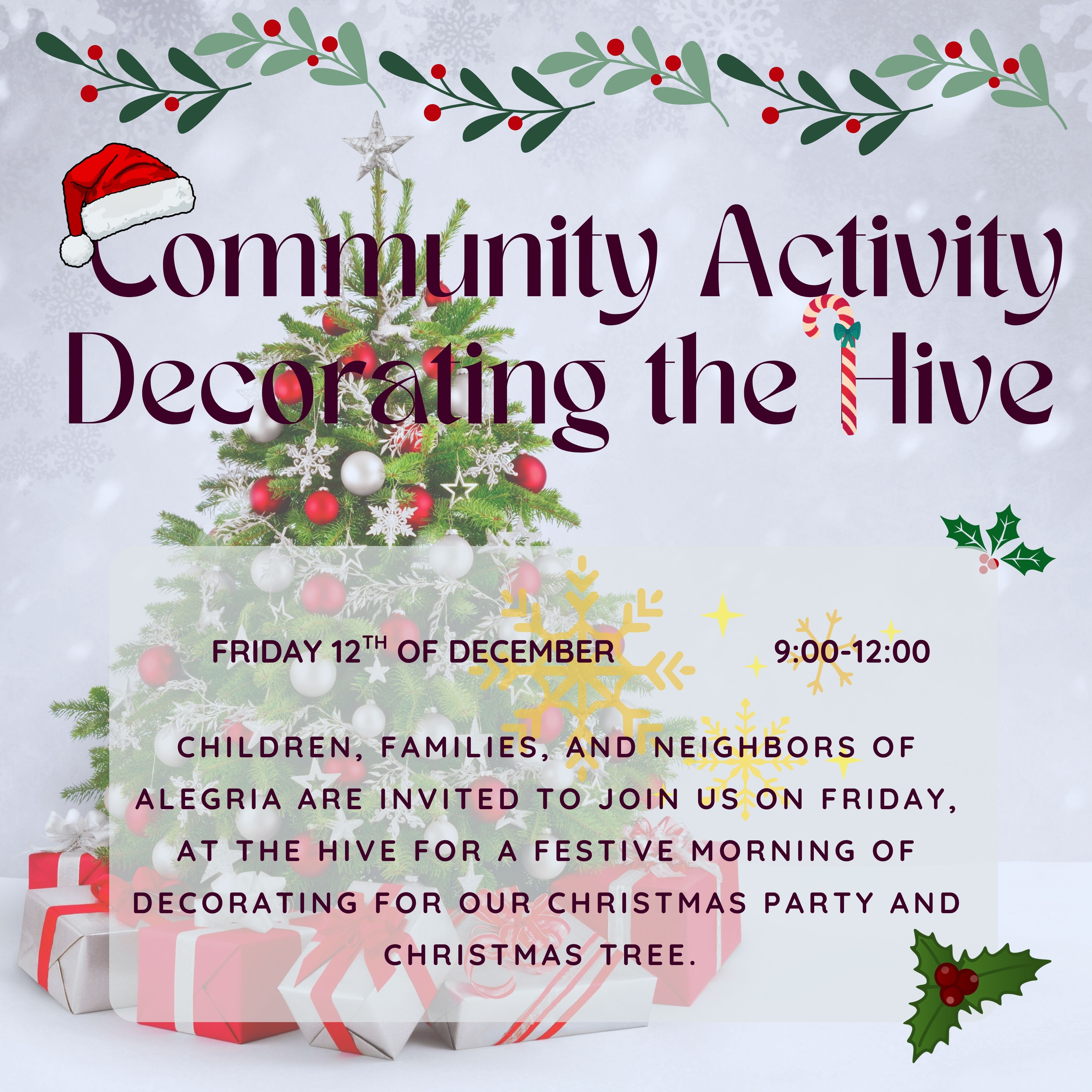 Children, families, and neighbors of Alegria are invited to join us on Friday, December 12, starting at 9:00 a.m, at The Hive for a festive morning of decorating for our Christmas party and Christmas tree.