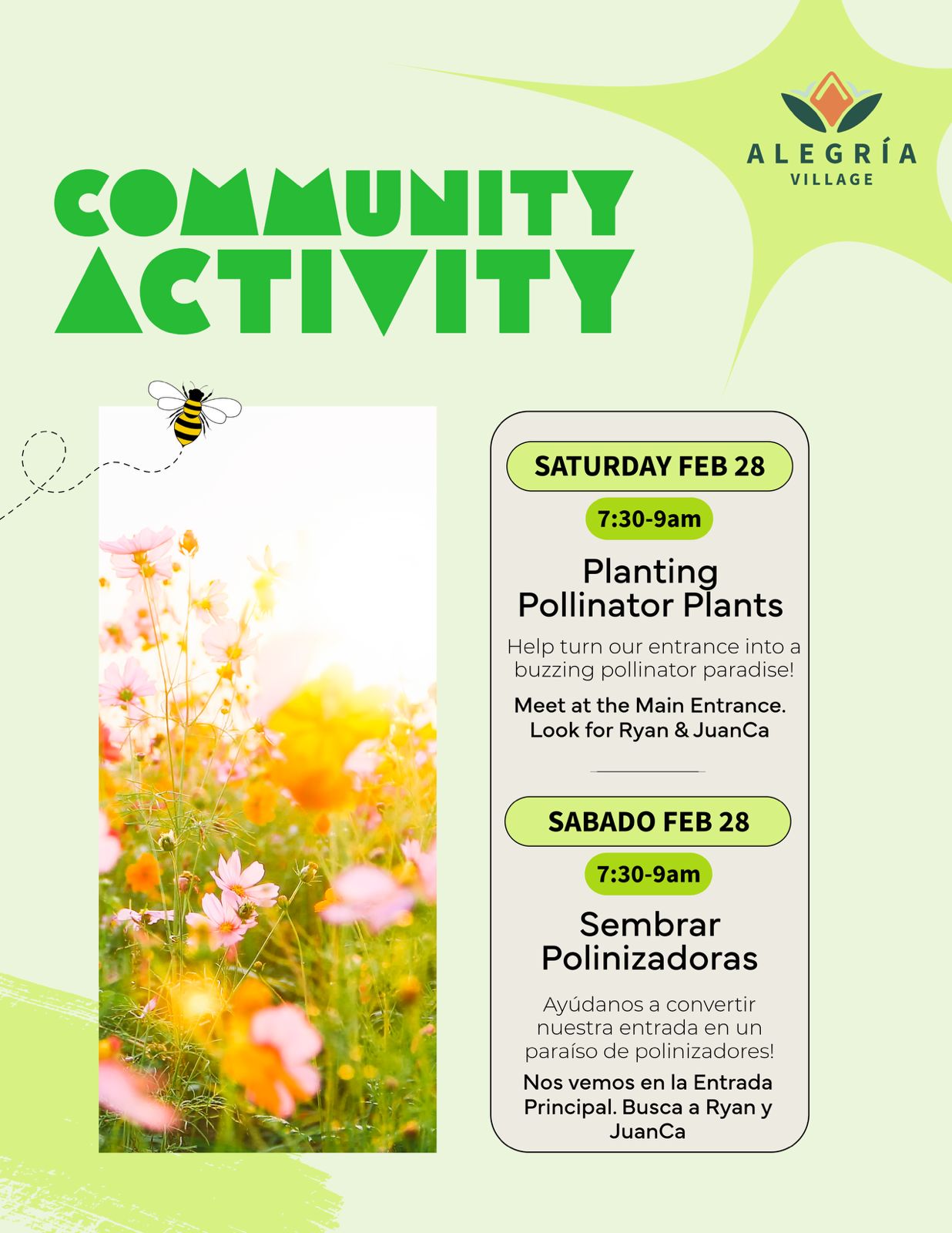 Event TypeCommunity Planting DayEvent dateFebruary 28, 2026LocationPaid?🆓PicturesThis Saturday! Let’s make our main entrance a little more welcoming for everyone 🌼🌻🌺🌸 // Este sábado! Hagamos que nuestra entrada principal sea un poco más acogedora para todos 🌼🌻🌺🌸