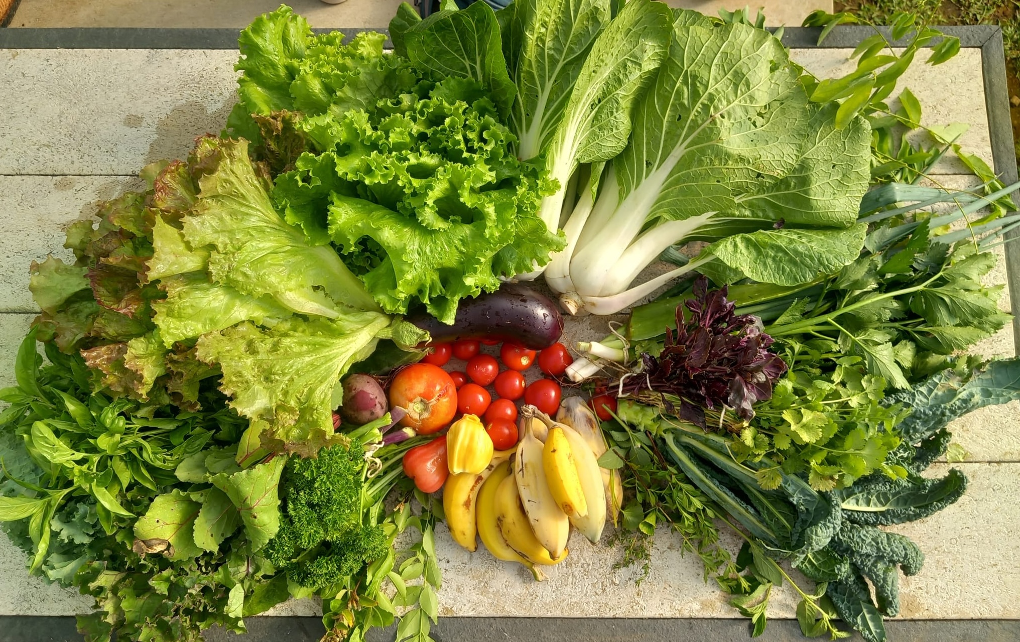 LettuceLettuce redPak ChoiArugulaTomatoRedbor KaleCurly KaleLacinato KaleSpring onionsBananaJamaican Bush MintCulantroAloe VeraJackfruitThymeCilantroCeleryCurry leavesBasilBasil thaiBeetrootKatukEggplantBlack pepperVerbenaSpearmintCucumberGotu KolaWater appleLemon drop mangosteenSissoo Spinach